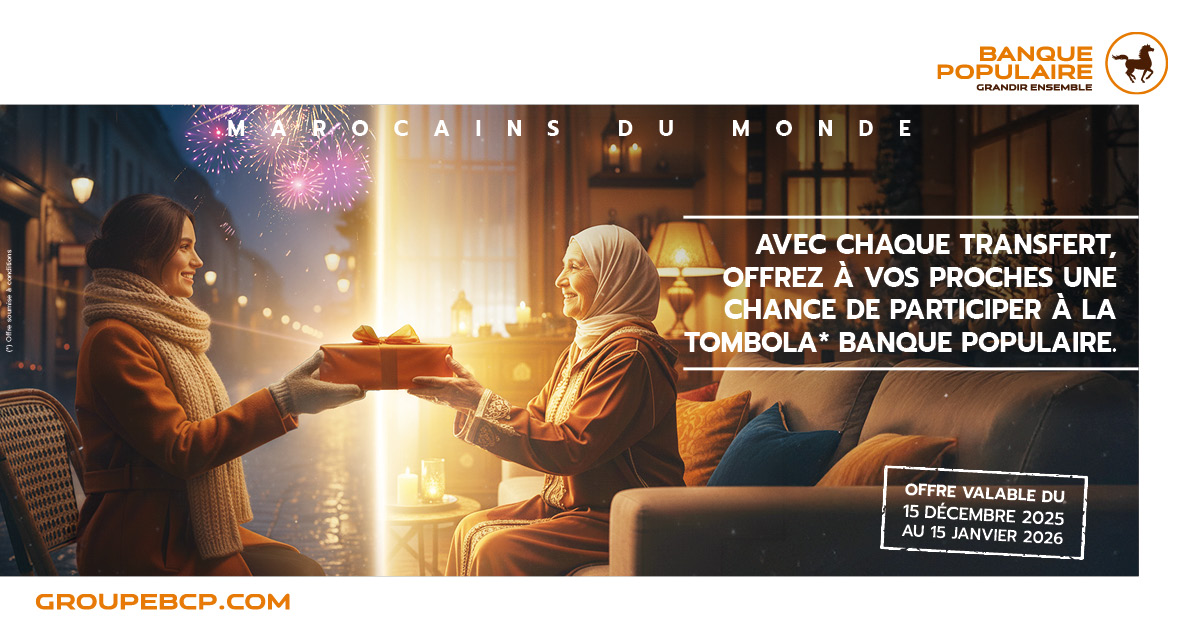 Du 15 décembre 2025 au 15 janvier 2026, chaque transfert reçu au Maroc via nos partenaires offre automatiquement à vos proches une participation au tirage au sort, avec de nombreux cadeaux à gagner.
